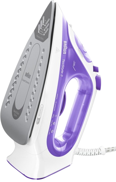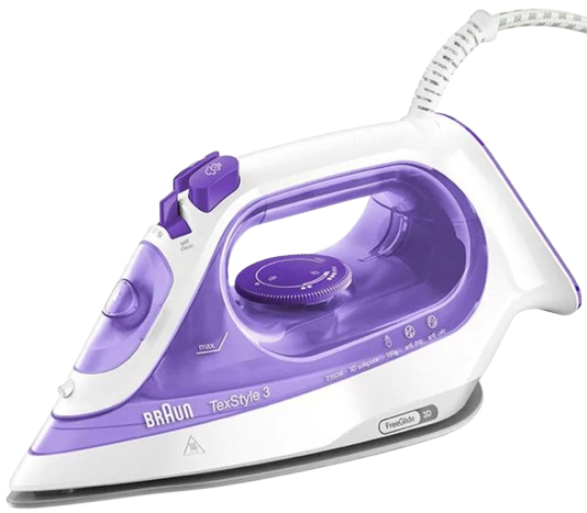 Braun SI 3042 VI — праска серії TexStyle 3 у фіолетовому виконанні з ексклюзивною підошвою FreeGlide 3D SuperCeramic. Унікальна особливість підошви — закруглений задній край, завдяки якому праска вільно ковзає в будь-якому напрямку на 360°, включаючи назад, обминаючи гудзики і застібки без зусиль. Поверхня підошви залишається гладкою протягом усього терміну використання.