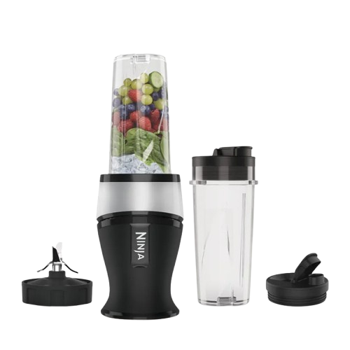 Ninja QB3001EUS — ультракомпактный персональный блендер Slim мощностью 700 Вт с двумя стаканами ёмкостью по 450 мл каждый. Устройство разработано для быстрого и удобного приготовления одиночных порций смузи, протеиновых шейков и фруктовых напитков дома, в офисе или спортзале.