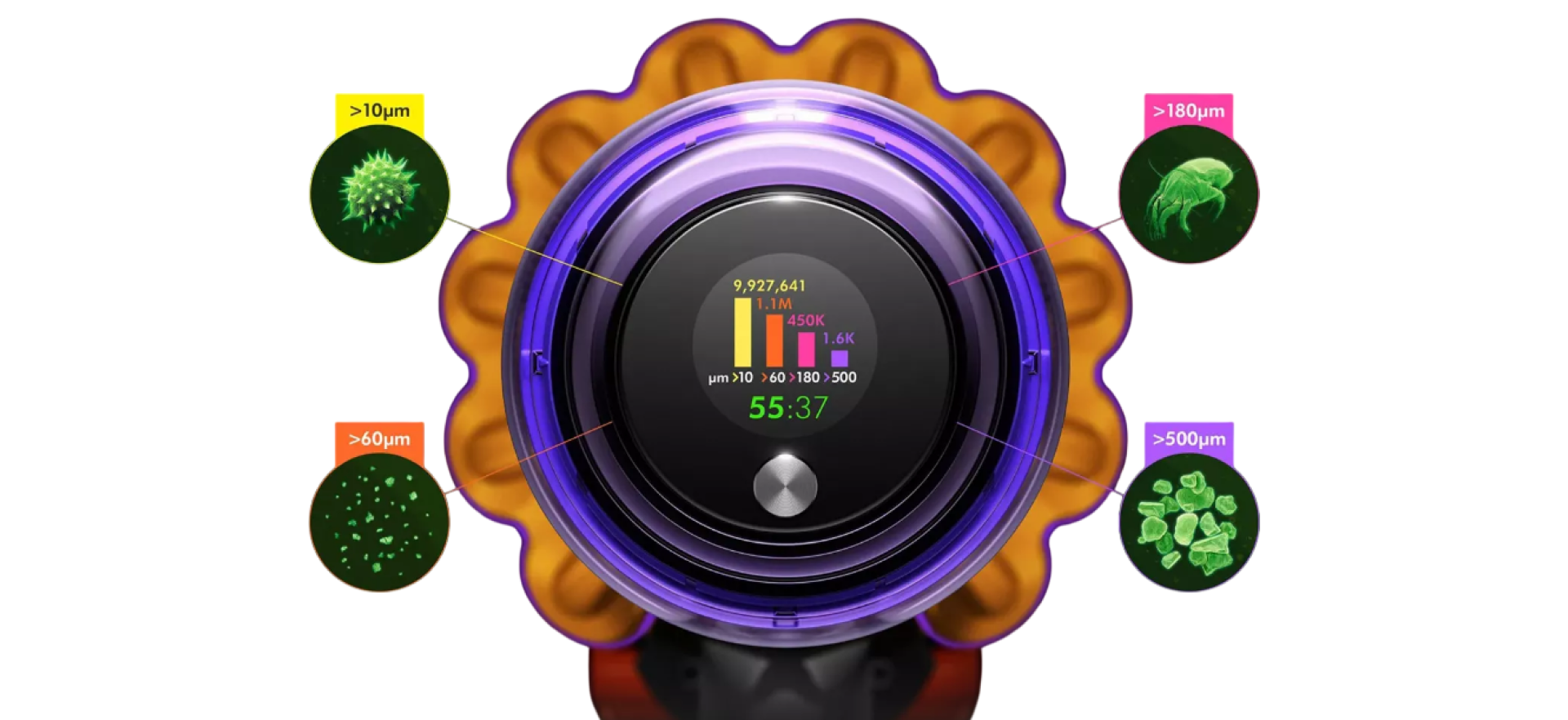 Встроенный LCD-дисплей показывает количество собранных частиц, режим работы и оставшийся заряд батареи. Dyson V15 анализирует тип и размер пыли, предоставляя наглядное подтверждение эффективности уборки. Это делает процесс более осознанным и контролируемым.